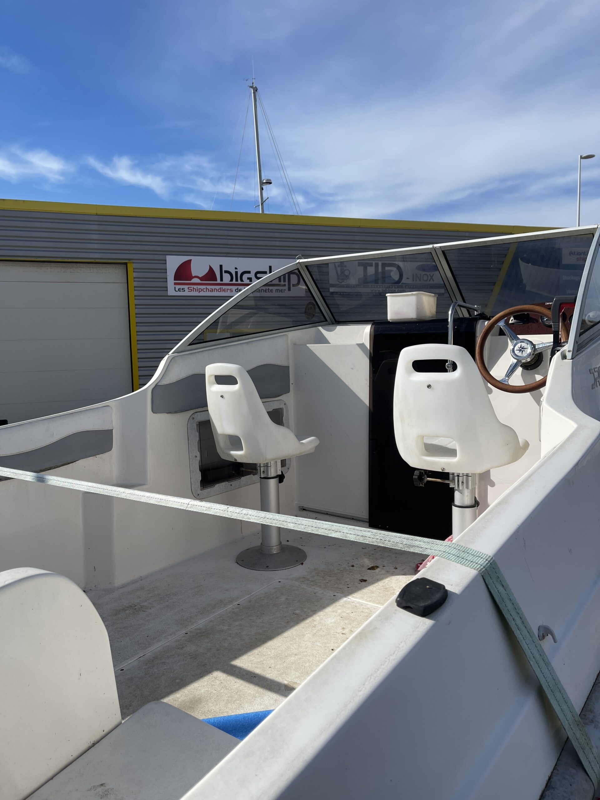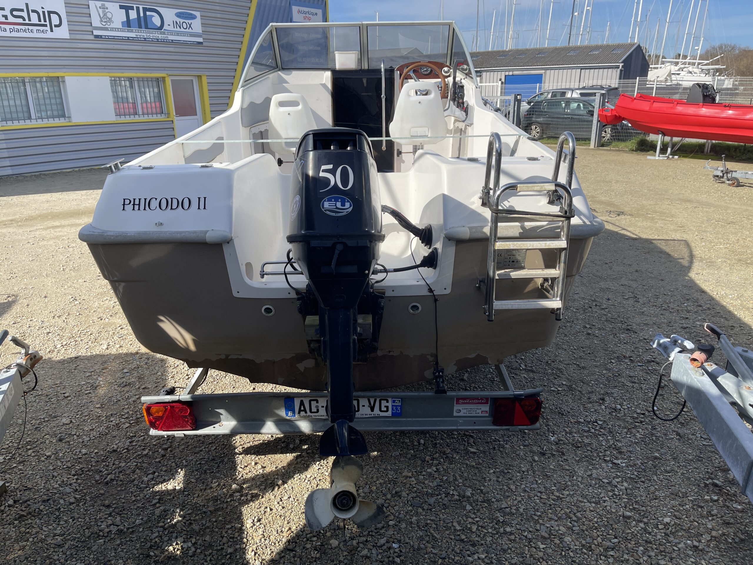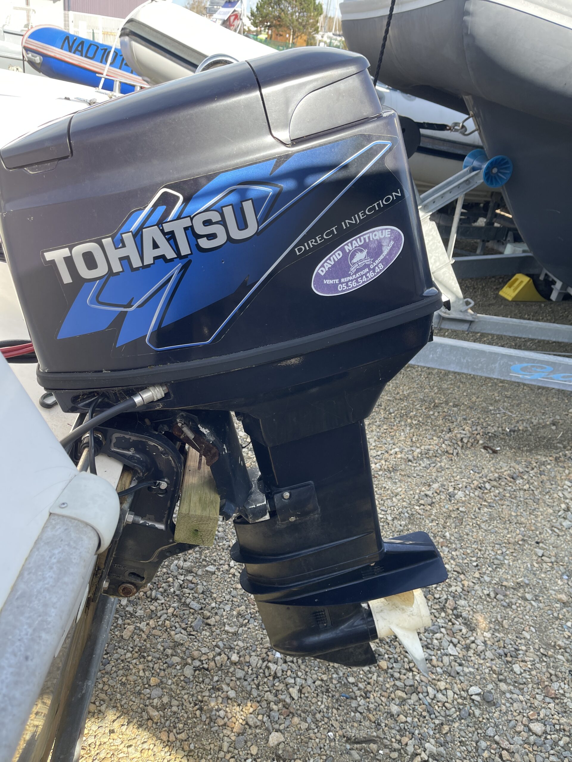 Il est équipé d’un moteur Tohatsu 50cv 2temps à injection direct, révisé. Il possède également une remorque de route Satellite avec treuil électrique dans un très bon état.